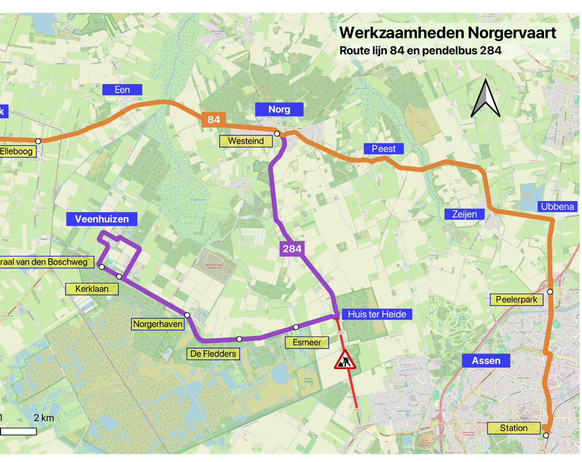 Gedurende de werkzaamheden rijdt lijn 84: vanaf Haulerwijk via Norg naar Assen. Hierdoor vervalt de rechtstreekse bediening van Veenhuizen en Kloosterveen door lijn 84. Download hier de dienstregeling tijdens de werkzaamheden.